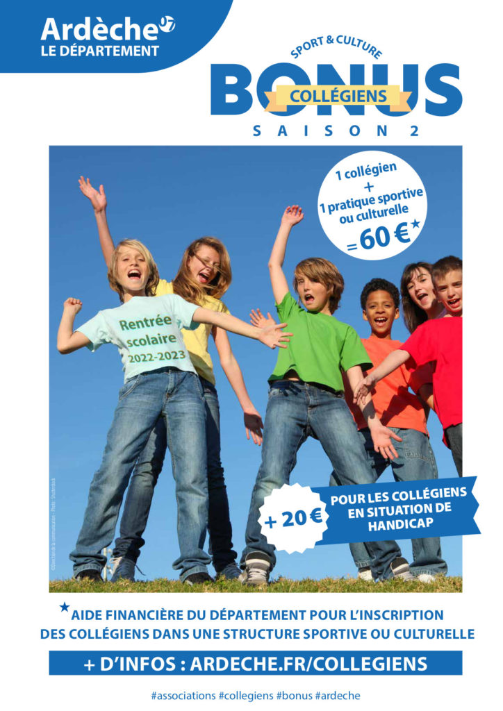 Le bonus collégiens du Département, c’est une aide de 60€* pour chaque collégien ardéchois qui s’inscrit dans une association ou une structure sportive ou culturelle d’Ardèche !