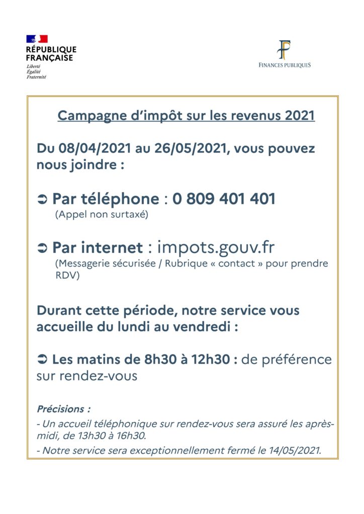 Veuillez prendre connaissance des modalités d’ouverture au public des Centres des finances Publiques du département, pendant la période de campagne d’impôts sur les revenus 2021, du 08/04/2021 au 26/05/2021, modalités portées sur l’affiche ci-dessous.