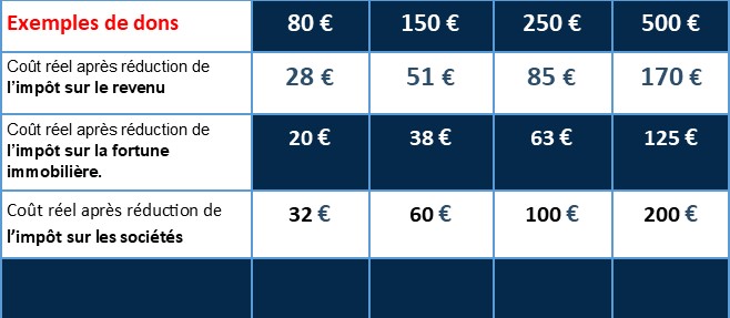 Réduction d’impôt de 66% du don dans la limite de 20% du revenu imposable. Coût réel après réduction de l’impôt sur la fortune immobilière.
