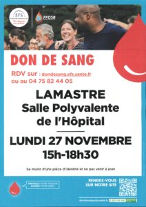 Don du sang à Lamastre le lundi 27 novembre de 15h-18h30 Par Corine Faure-Bassano|2023-11-06T12:10:58+01:006 novembre 2023|A la une|0 commentaire