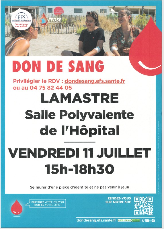 Don du sang à Lamastre le vendredi 11 juillet Par Corine Faure-Bassano|2025-06-30T12:20:14+02:0030 juin 2025|A la une|0 commentaire