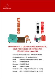 Horaires d’ouverture de la déchetterie à Lamastre Cliquez sur l’image pour voir l’affiche. Veuillez noter que la déchetterie de Lamastre est ouverte : le mercredi de 16h00 à 18h00 et non de 15h00 à 18h00. Par Corine Faure-Bassano|2020-12-07T11:56:39+01:007 décembre 2020|A la une|0 commentaire