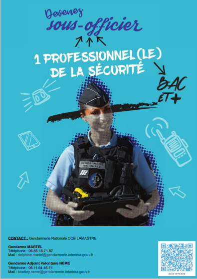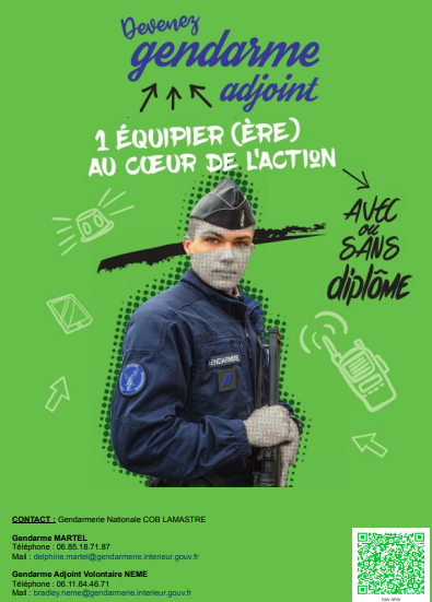 La GENDARMERIE poursuit sa campagne de recrutement. Cette démarche revêt un caractère important à l’heure actuelle afin que la GENDARMERIE ait la force humaine nécessaire de demain pour se mettre au service de nos concitoyens. Toute personne intéressée doit contacter la gendarmerie de Lamastre :