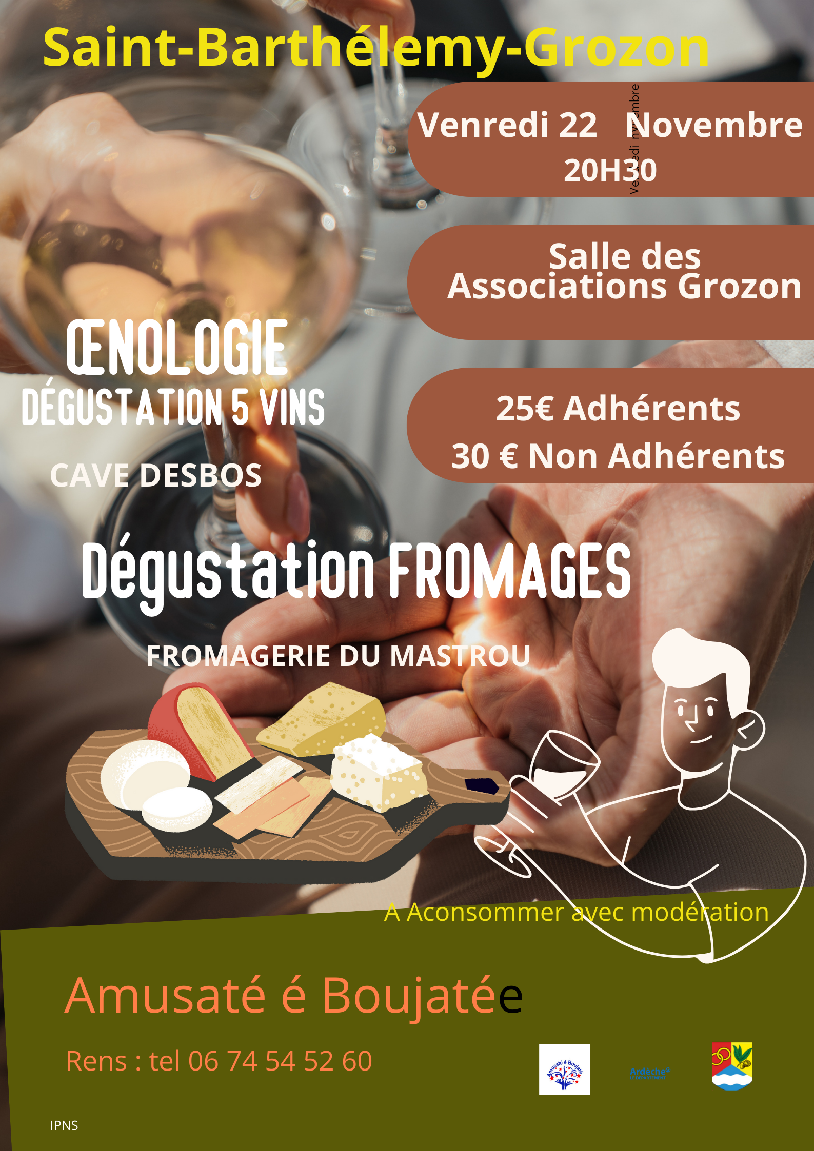 Amusaté é Boujaté organise une soirée oenologie avec une dégustation de fromages le vendredi 22 novembre à 20h30 à la salle des associations de Grozon. Cette soirée sera animée par Marielle de la cave Desbos et par Cédric de la Fromagerie du Mastrou.