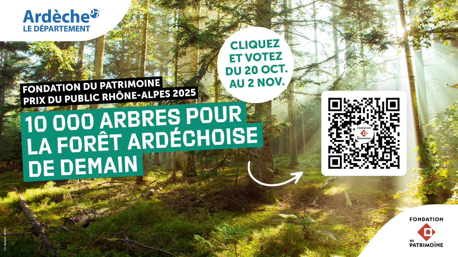 Le projet ardéchois « 10 000 arbres pour la forêt ardéchoise de demain » a été sélectionné par la Fondation du patrimoine comme candidat pour l’Ardèche, dans le cadre du Prix du public Rhône-Alpes 2025Il est en compétition avec 7 autres projets qui représentent chacun leur département…c’est également le seul projet de patrimoine naturel.