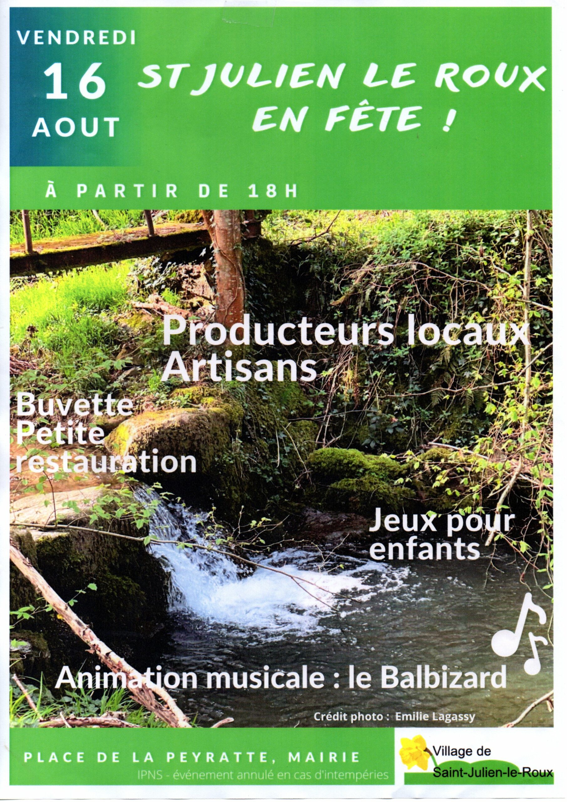 La troisième édition de St Julien le Roux en fête aura lieu le 16 août : marché artisanat produits locaux, buvette petite restauration jeux pour enfants musique et bonne humeur